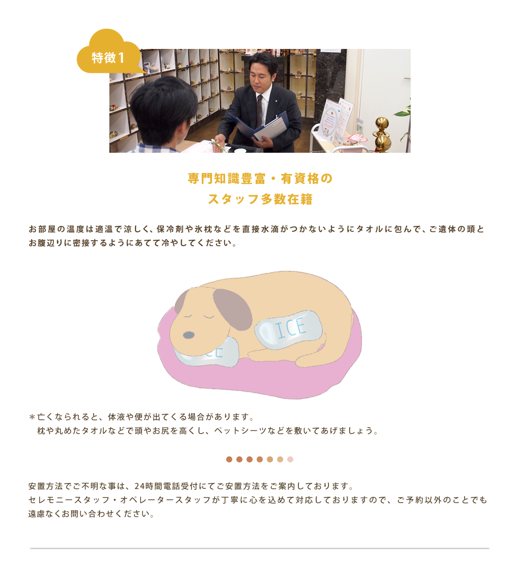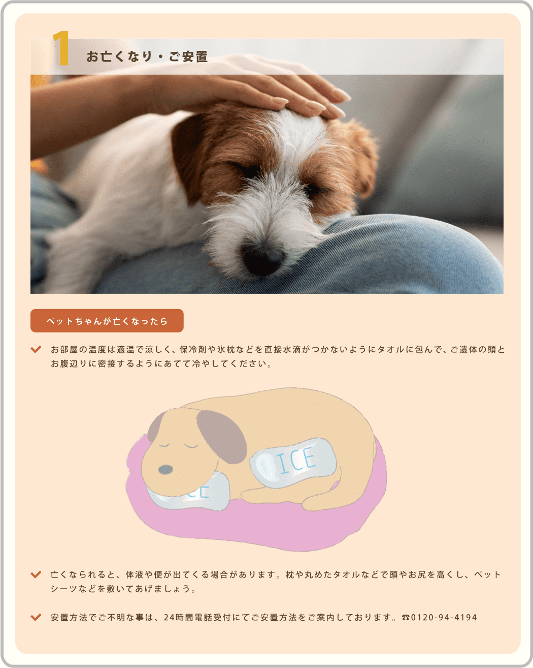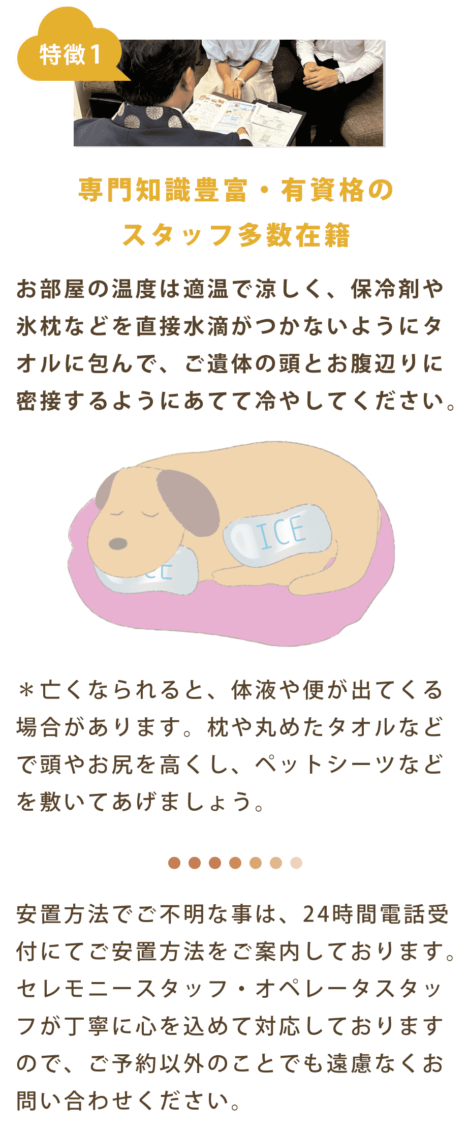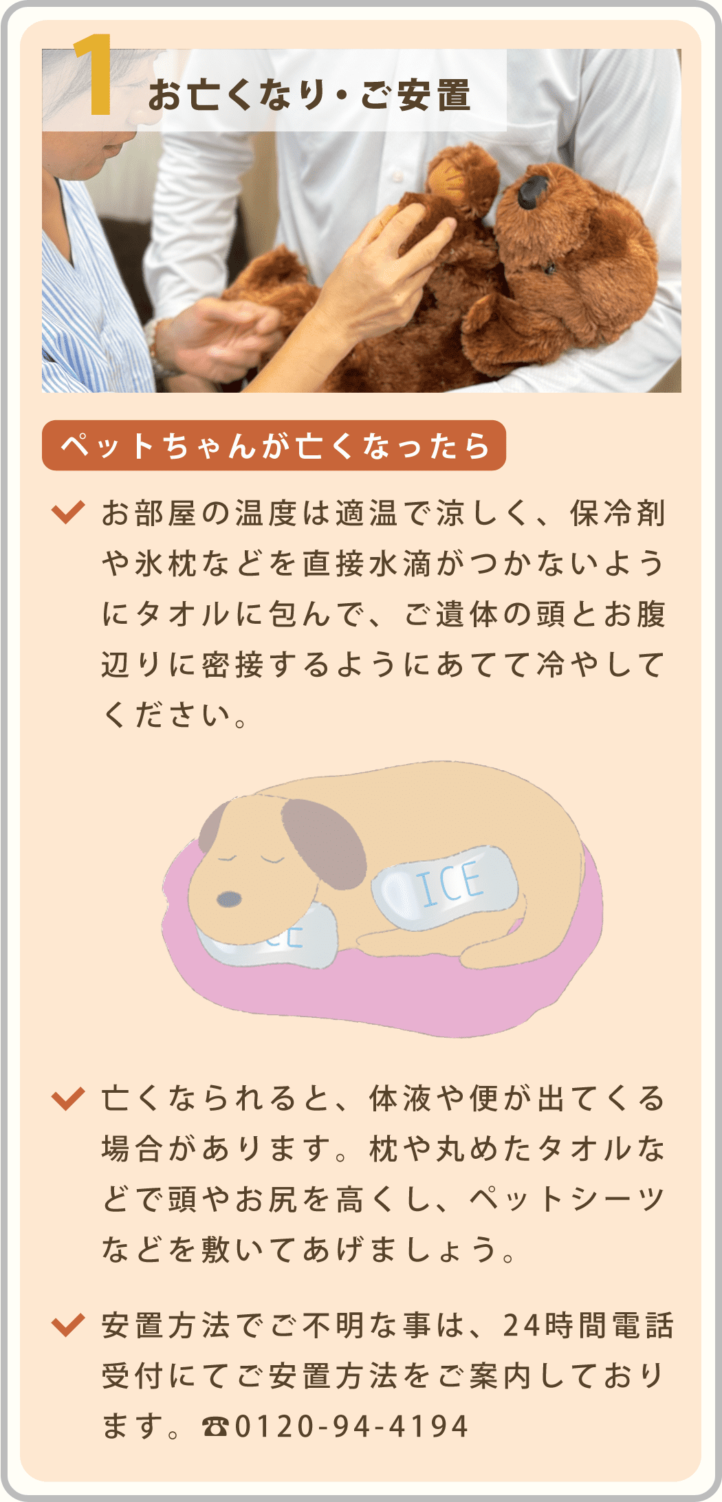 ペットのご遺体は涼しく、直射日光の当たらない場所に安置することをおすすめします。また、できるだけ体を冷やすために保冷剤や氷を使用すると良いでしょう。安置の仕方が不安な場合は、オペレーターがお受付時にアドバイスいたしますのでご安心ください。