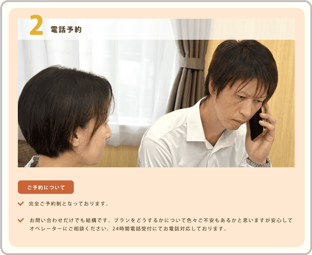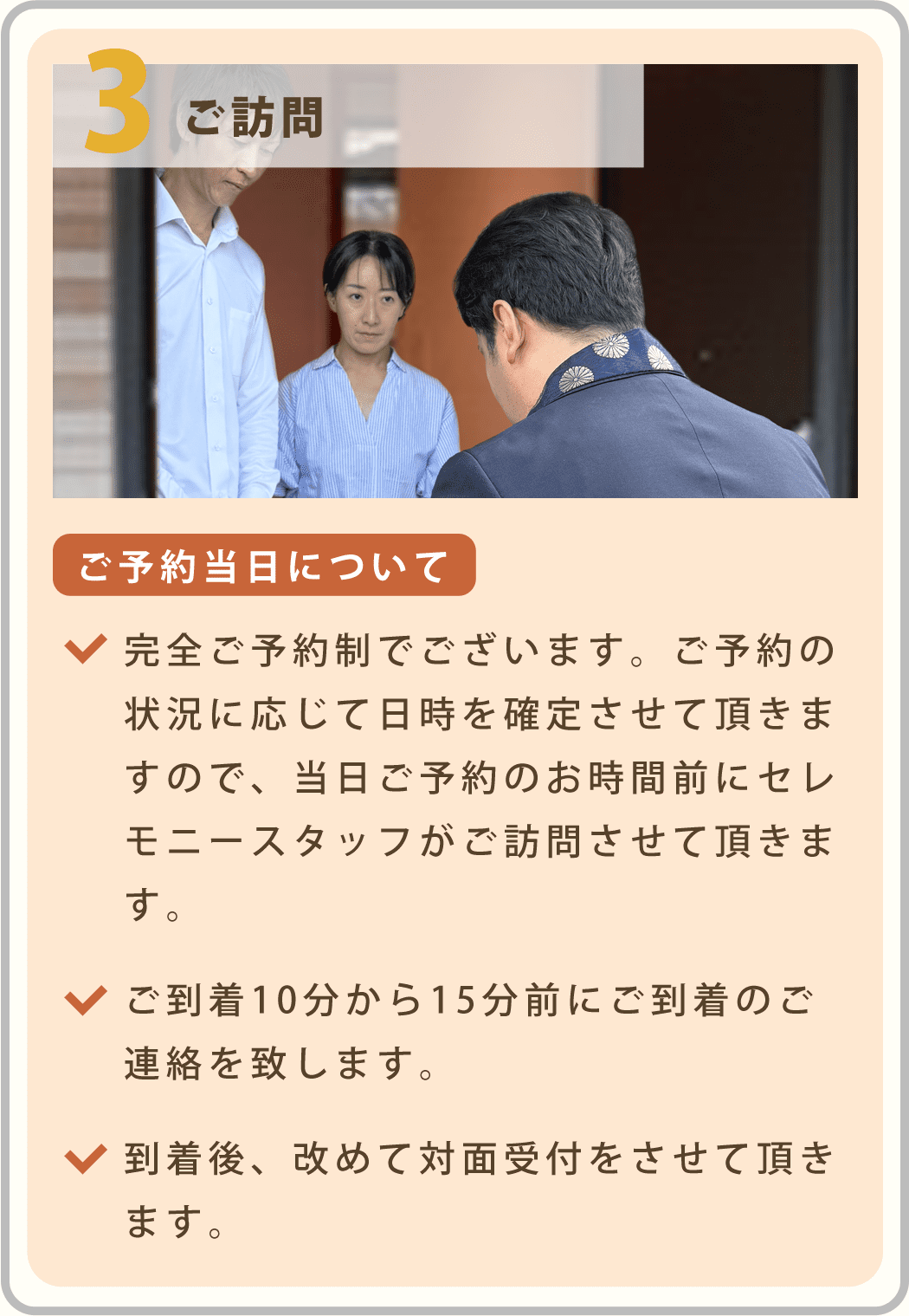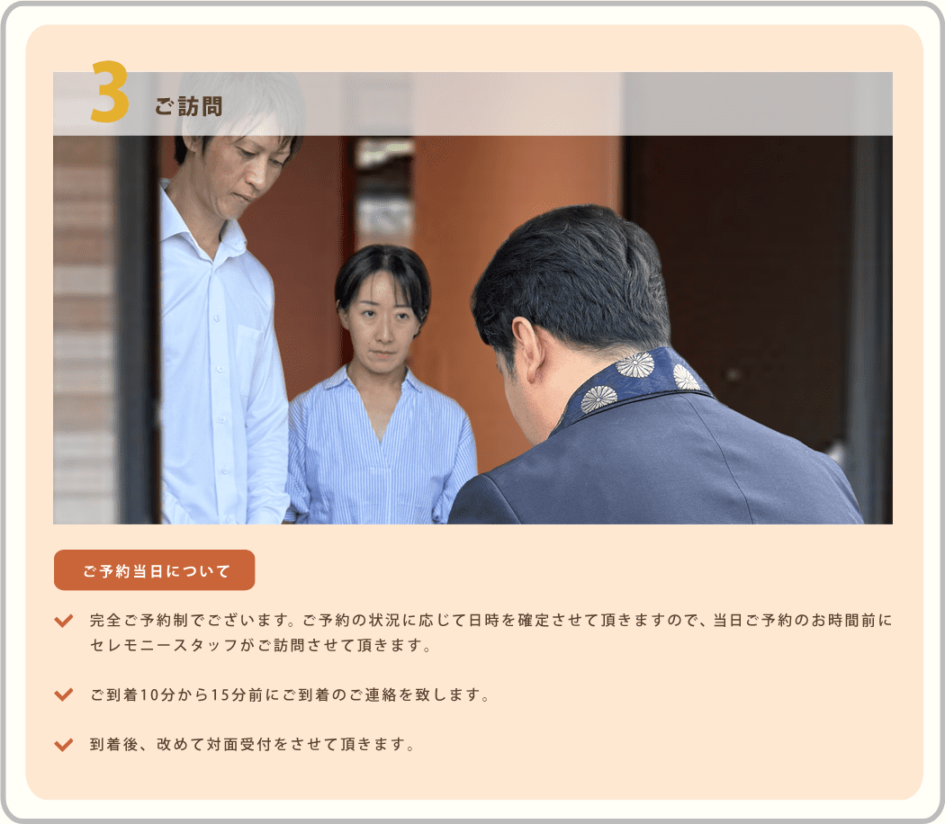 ご自宅だけでなく、近隣の静かな場所で落ち合うことも可能です。到着前5分前にセレモニースタッフから電話がありますので落ち合う場所のご相談も可能です。