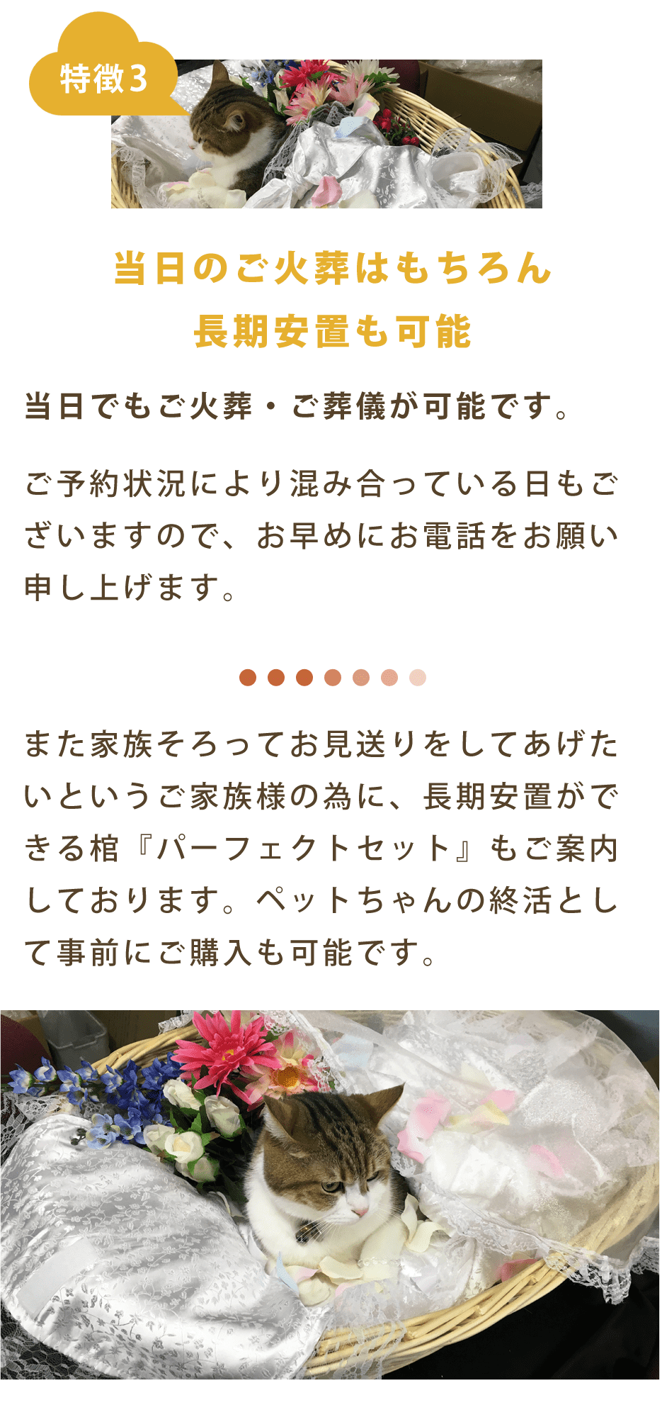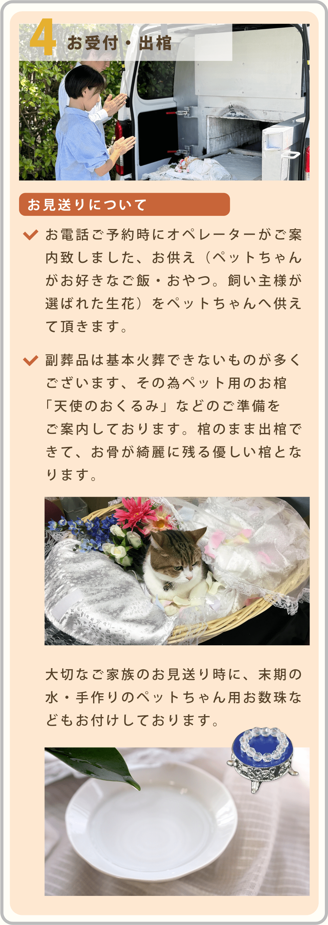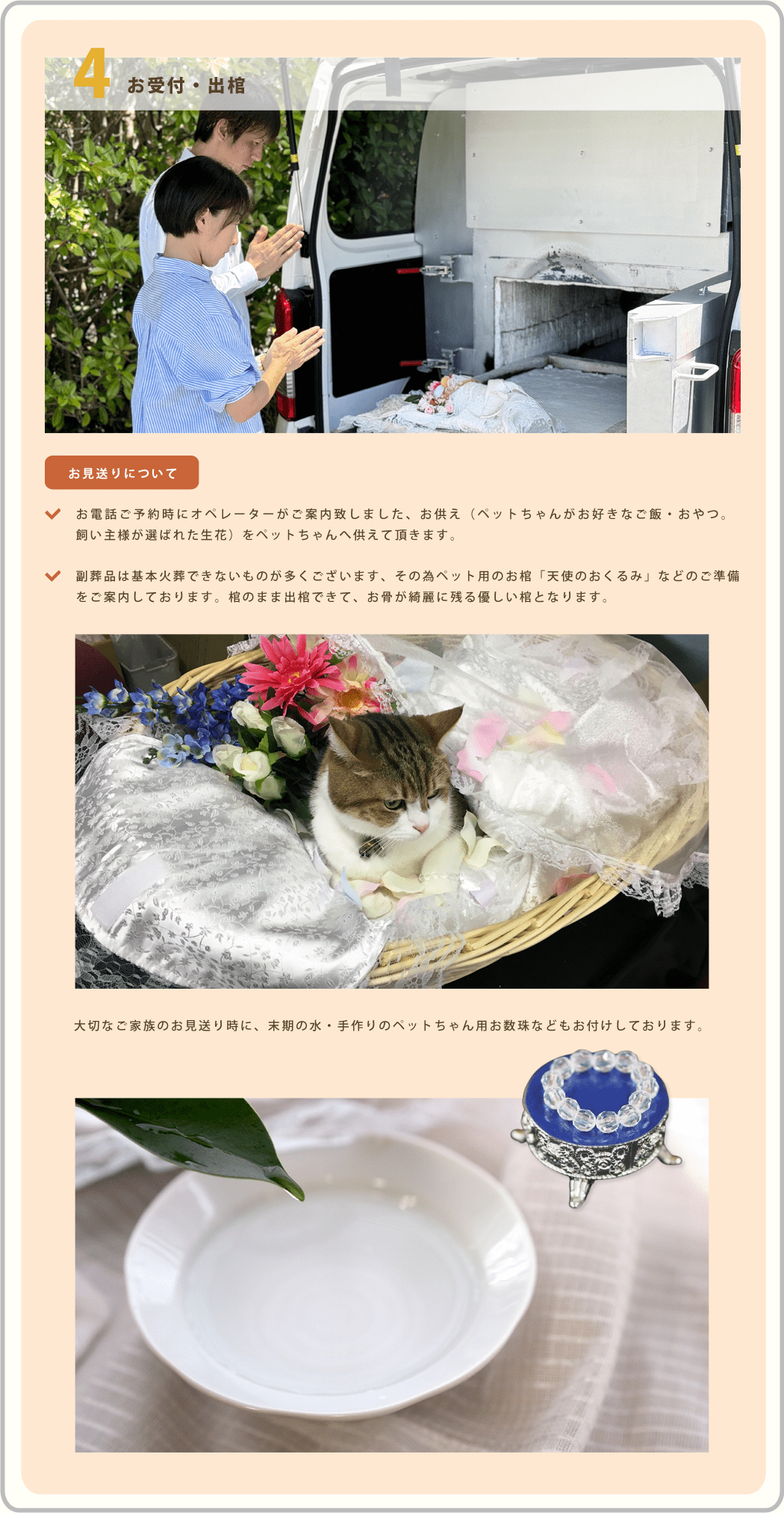 特別なご用意は必要ありませんが、ペットと一緒に火葬が出来る物として「お花」「ごはん」があります。一緒にご火葬出来るお棺は当社でご用意できます。また、特別なご希望があれば、お受付時にお伝えください。
